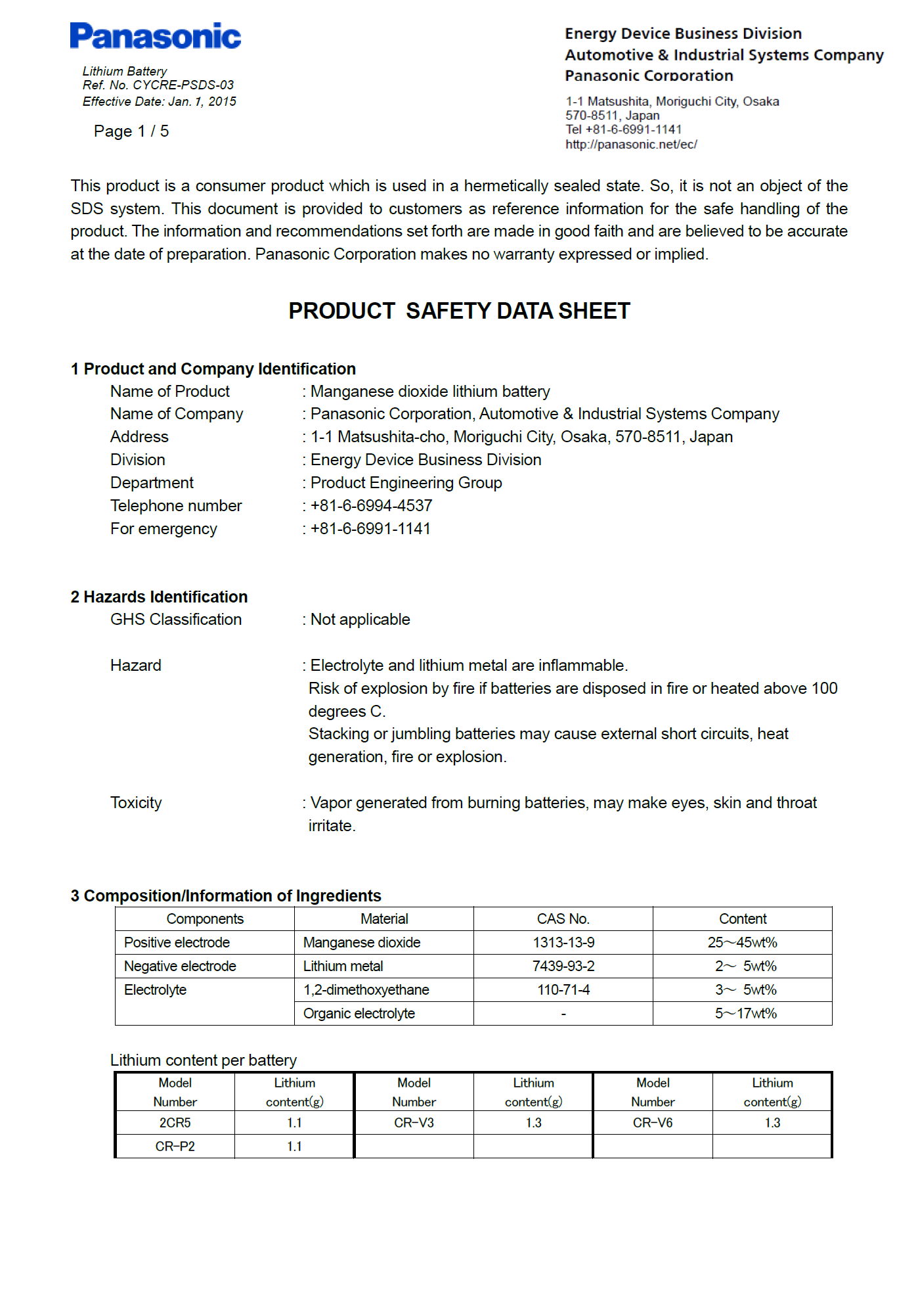 Panasonic Lithium Batteries Product Safety Data Sheet
